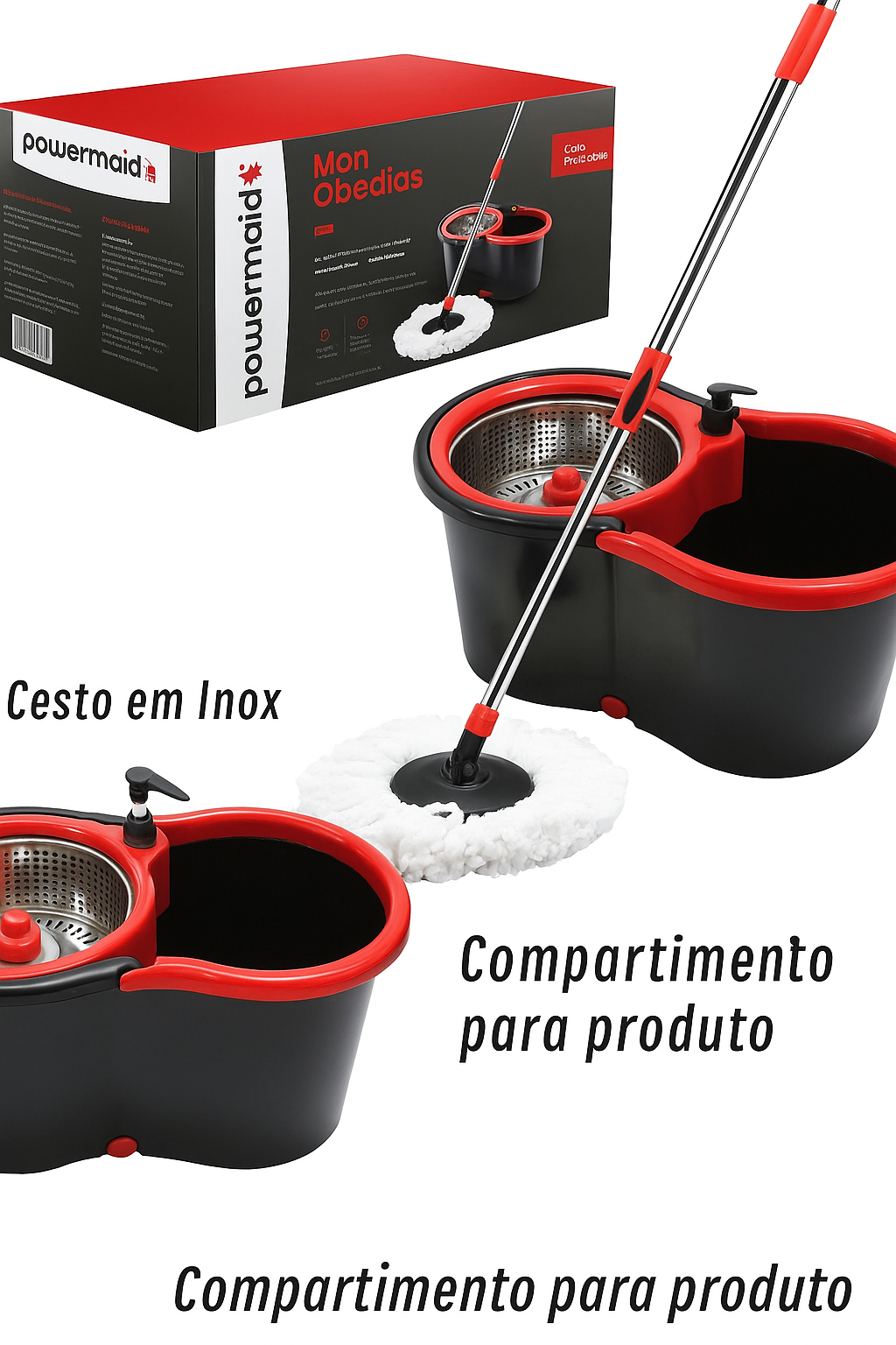 Com seu balde equipado com um cesto em inox durável, o PowerMaid apresenta uma estrutura robusta e resistente ao uso constante. Além disso, seu sistema moderno possui um compartimento duplo que separa as funções de enxágue e centrifugação, proporcionando uma experiência de limpeza organizada e sem complicações.